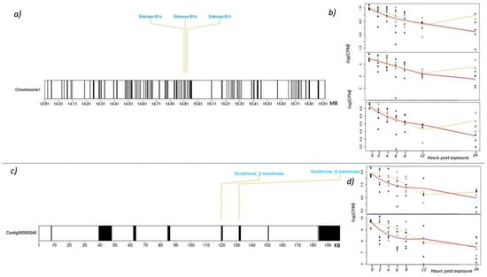 (a) Ideogram of the boll weevil gene region surrounding the three tandem esterase B1 genes on Chromosome 1. (b) Expression of each esterase B1 over 24 h (log transformed counts per million). The yellow line indicates the transcriptomic response to the low concentration treatment and the red line indicates the high concentration treatment. Closed circles represent gene expression values for individual weevils exposed to the high concentration of malathion, and open circles are weevils exposed to the low concentration. (c) Schematic of two tandem glutathione S-transferases (GST) and the surrounding 198 KB region on contig: ctg00000340. (d) Expression of each GST over 24 h (log transformed counts per million). The yellow line indicates the transcriptomic response to the low concentration treatment and the red line indicates the high concentration treatment. Closed circles represent gene expression values for individual weevils exposed to the high concentration of malathion, and open circles are weevils exposed to the low concentration.