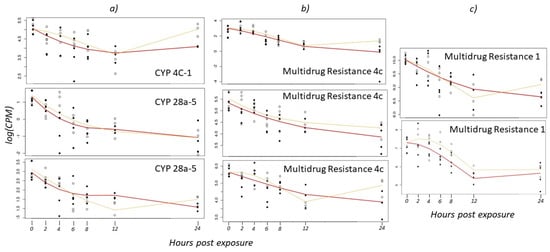 Gene expression in the boll weevil across 24 h following exposure to low and high concentrations of malathion for (a) three cytochrome P450 (CYP450) genes, (b) three multidrug resistance 4c genes, and (c) two multidrug resistance 1 genes (log transformed counts per million). The yellow line indicates the transcriptomic response to the low concentration treatment and the red line indicates the high concentration treatment. Closed circles represent gene expression values for individual weevils exposed to the high concentration of malathion, and open circles are weevils exposed to the low concentration.