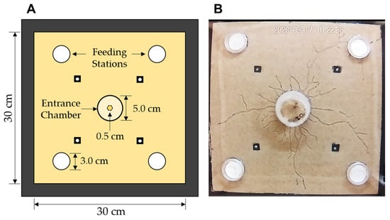The foraging arena (Figure 1A) was adapted from a previous study [38]. It consisted of two clear Plexiglas sheets (35 × 35 × 0.6 cm3) divided by a border of black Plexiglas sheets (two pieces of 35 × 2.5 × 0.2 cm3, two pieces of 30 × 2.5 × 0.2 cm3), which created an open-area space of 30 × 30 × 0.2 cm3. Four Plexiglas spacers (1.0 × 1.0 × 0.2 cm3) were placed in the open area and glued to one of the Plexiglas sheets, each one 12 cm from one of the four corners. A hole was drilled through the Plexiglas sheets and each spacer, and a nut and bolt were used to secure the three layers, thus preventing the Plexiglas sheets from warping during the experiment. Five holes were drilled into the top layer of the Plexiglas sheet: one for an external entrance chamber and four for external food chambers (i.e., feeding stations). The holes drilled for the feeding stations were approximately 2.5 cm in diameter to ensure that, upon discovery, the termites encountered the filter paper. The entrance chamber (5.0 cm in diameter, 1.5 cm in height) was in the center, and each of the four food chambers (3.0 cm in diameter, 1.0 cm in height) were 6.0 cm from their closest respective corners. All chambers were fixed to the Plexiglas sheet with hot glue before the experiment to prevent the escape of termites or moisture.