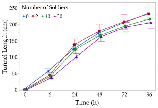 Changes in total tunnel length during exploratory foraging phase. Tunnels were constructed by groups of 100 foraging workers with different numbers of soldiers. Data shown are means ± SEM. No significant difference was detected among treatments at any time point (LMM, p > 0.05, n = 16).
