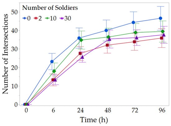 Changes in number of tunnel intersections during exploratory foraging phase. Tunnels were constructed by groups of 100 foraging workers with different numbers of soldiers. Data shown are means ± SEM. No significant difference was detected among treatments at any time point (NB-GLMM, p > 0.05, n = 16).