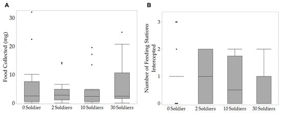 (A) Total food collection and (B) number of feeding stations intercepted in 96 h by groups of 100 foraging workers with different numbers of soldiers. Boxes are bounded by the 25th and 75th percentiles, bands are medians, whiskers represent minimum and maximum values, and dots outside of whiskers are outliers. No significant difference was detected among treatments (food collection: ziG-GLMM, p > 0.05; number of feeding stations intercepted: ziB-GLMM; p > 0.05, n = 16).