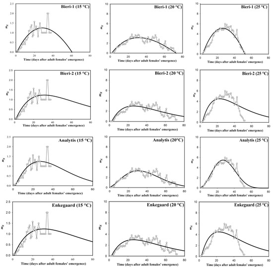 Fitting four non-linear models to observed age-specific fecundity (mx) of S. gilvifrons at six constant temperatures. Thin light lines and open circles represent the observed data [25].