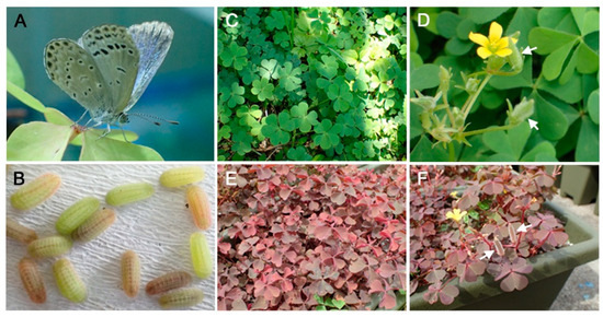 The pale grass blue butterfly Z. maha (Figure 1A) and its host plant, the creeping wood sorrel O. corniculata (green form) (Figure 1C,D), were collected from the Nishihara campus of the University of the Ryukyus and its vicinity. This butterfly species is distributed throughout Japan, except for Hokkaido [32,33,34,56], and is the most abundant butterfly found in Japan [57]. The host plant has green and red forms, and the latter is called O. corniculata f. rubrifolia [58]. The less reddish forms are often called O. corniculata f. tropaeoloides [58] and O. corniculata f. atropurpurea [59]. In the present study, we used plants with leaves, stems, calyxes, and fruits that were dark red as the red form of this species. In addition to a collection from the university campus, red form plants were collected from mainland Japan (Tokyo and Kyoto) and sent to the university for experimental use (Figure 1E,F).