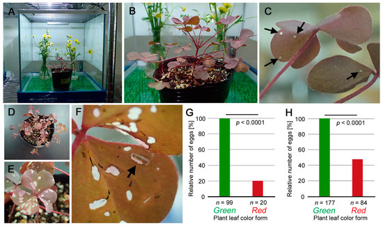 Suitability of red form plants for oviposition behavior and larval growth. (A) Presentation of the red form plant in a glass container. The green form plant was presented before and after the red form plant in the same set-up. (B) High magnification of (A). (C) Eggs deposited on the red form leaves (arrows). (D) Top-down view of the red form plant several days after the beginning of the egg collection process. (E) High magnification of (D). (F) A larva on the lower side of a red form leaf (arrow). (G) Sequential choice behavioral test for oviposition preference. The number of eggs was counted and expressed as relative percentages. The number of eggs on the green form plant was adjusted to 100%. The indicated p-value was a result of the χ2 goodness-of-fit test. (H) Two-choice behavioral test for oviposition preference. The number of eggs was counted and treated as in (G).