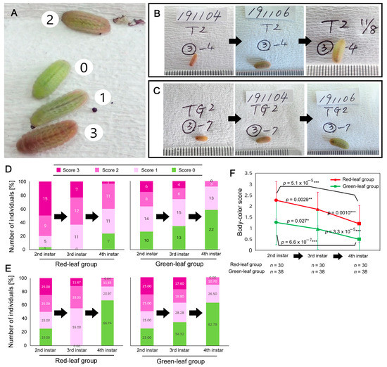 According to the body color scoring system (Figure 3A) (see Section 2), we focused on 30 individuals from the red-leaf-eating group and 38 individuals from the green-leaf-eating group, which we reared individually in small Petri dishes. As shown in the examples (Figure 3B,C), the body color changed over time in both the red leaf and green leaf groups (Figure 3D–F, Tables S2–S5). The body color scores significantly decreased from the second instar stage to the third instar stage and from the third instar stage to the fourth instar stage in both the red leaf and green leaf groups (Figure 3F). Thus, red larvae were most frequent at the second instar stage and least frequent at the fourth instar stage, demonstrating a stage-specific effect.
