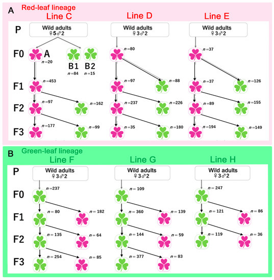 We established two “lineages” for comparison: the red leaf lineage (reared on red leaves across generations, from F0 to F3) and the green leaf lineage (reared on green leaves across generations, from F0 to F3). For each lineage, three independent genetic “lines” were produced from three founder females and two males in each case. To test for maternal effects, we constructed sibling subgroup branches by feeding leaves of the opposite color to a portion of the siblings. These two sibling subgroups were considered genetically indistinguishable. See the Results, Section 3.3, for the lineages, lines, and sibling subgroup branches that were produced in this study.