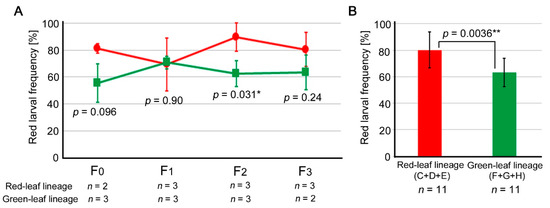We summarized the “lineages” (red and green lineages) and “lines” (Lines C, D, and E for the red leaf lineage and Lines F, G, and H for the green leaf lineage) produced in this study (Figure 4, Tables S6–S10). When three lines were combined for each generation (excluding the sibling subgroup branches), the red larval frequencies were significantly different between the red leaf and green leaf lineages in the F2 generation (p = 0.031; Student’s t-test) (Figure 5A). The F0 and F3 generations did not show a statistically significant difference, despite the red leaf lineage having larger frequencies, but this could be due to the small sample size. Similarly, the fact that the F1 generation was without any difference could be due to the small sample size. When all the lines of all the generations were examined together, the red larval frequency of the red leaf lineage was significantly higher than that of the green leaf lineage (Figure 5B).