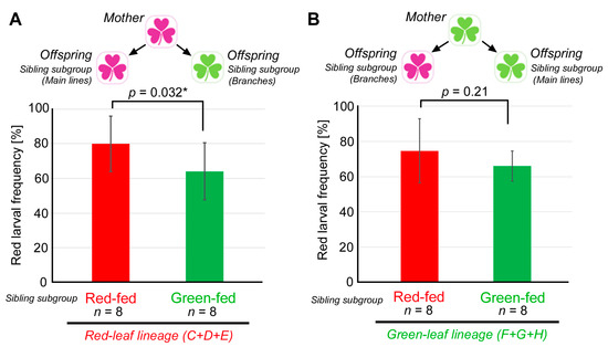 Sibling subgroup comparisons of the red larval frequency to test interactions between the maternal and offspring diets. An asterisk indicates statistical significance at the level of p < 0.05 (bi-sided paired t-test). (A) Red leaf lineage (Lines C, D, and E). (B) Green leaf lineage (Lines F, G, and H).
