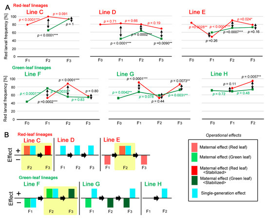 Operational maternal effects and operational single-generation effects in the six independent lines (Lines C, D, and E in the red leaf lineage and Lines F, G, and H in the green leaf lineage). For definitions, see the Section 2. Asterisks indicate statistical significance: *, p < 0.05; **, p < 0.01; ***, p < 0.001 (Fisher’s exact test). (A) Dynamics of the red larval frequencies. The upper three panels indicate the red leaf lineage, and the bottom three panels indicate the green leaf lineage. Red or green p-values indicate the results of the two successive generations. Black p-values indicate the results of a sibling subgroup branch and its corresponding main line (double-headed arrows) for a given generation. (B) Effect diagrams (interpretations of (A)) used to intuitively understand the operational maternal and single-generation effects. The upper three panels indicate the red leaf lineage, and the bottom three panels indicate the green leaf lineage. An effect is shown by a plus/minus unit box. Operational maternal effects are indicated by reddish boxes for the red leaf lines and by greenish boxes for the green leaf lines. Operational single-generation effects are indicated by blue boxes. A given generation has room for two boxes, one for the operational maternal effect and one for the operational single-generation effect, but no box is shown when no operational maternal or single-generation effect was detected. The experimental results that realized the theoretically expected model dynamics of the maternal effects are highlighted in yellow in Lines C, E, and F.