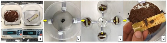 A structure of five circular plastic containers, 1 L, with one central container (E) connected by plastic cylindrical hose outlets, measured as having a 9.53 mm diameter and 10 cm length, to the other four containers (A, B, C, D), was built (Figure 1c) based on previous studies [17,18,19]. Containers A and B (controls) were arranged diagonally and were filled with 80 g of untreated soil. Containers C and D were filled with 80 g of soil treated with insecticide (Figure 1a). Insecticide soil treatment was conducted in 50 L pots with ratoon sugarcane plants of the CTC 4 variety (Centro de Tecnologia Canavieira S.A., Piracicaba, SP, Brazil) in a pot mixture of soil, sand and manure in a proportion of 3:1:1, respectively. Soil samples were taken for soil analysis at the Soil Fertility Laboratory at UNESP following the methodology of Raij et al. [20], to determine organic matter content (14 g dm−3) cation exchange capacity (73 mmolc dm−3), base saturation (81%) and soil pH (6.0).