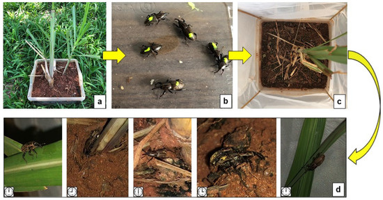 Figure 2. Methodology for the S. levis adult activity pattern study including ratoon sugarcane in containers (a); placement of 20 marked S. levis adults (b) in containers under natural weather conditions (c); and hourly insect activity evaluations recording adult location and behavior (d).