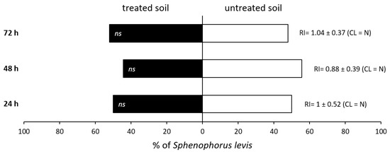 Figure 3. Percentage of S. levis adults that moved to soil treated with lambda-cyhalothrin + thiamethoxam and to untreated soil per evaluation period. Each bar represents the mean results of four replicates of two study repetitions. Repellency index (RI) with SD and RI classification (CL) are provided. ns—no significant differences were observed at α = 0.05. N—neutral activity.