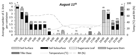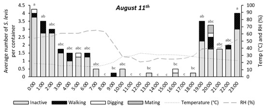 Figure 4. Number of visible S. levis adults per container at every hour on 11 August considering insect activity, temperature (temp) and relative humidity (RH%). Bars with mean values followed by same letter are not different at α = 0.05.