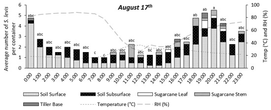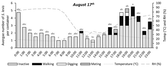 Figure 5. Number of visible S. levis adults per container at every hour on 17 August considering insect activity, temperature (temp) and relative humidity (RH%). Bars with mean values followed by same letter are not different at α = 0.05.