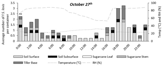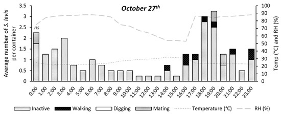 Figure 6. Number of visible S. levis adults per container at every hour on 27 October considering insect activity, temperature (temp) and relative humidity (RH%). ns—no significant differences were observed at α = 0.05.