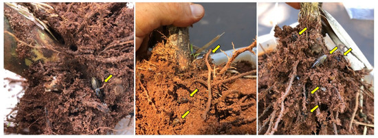Figure 10. Sphenophorus levis adults attached to sugarcane rhizomes and roots. Yellow arrows indicate S. levis adults.