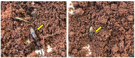 Figure 11. Sphenophorus levis adults found freely on soil and not attached to sugarcane rhizomes and roots as indicated by yellow arrows.