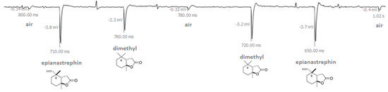 Example of electroantennographic output when an antenna of a sexually immature male of Anastrepha fraterculus was exposed to a series of air pulses (puffs) in this order: air, epianastrephin, (±)-trans-tetrahydroactinidiolide (dimethyl), air, (±)-trans-tetrahydroactinidiolide (dimethyl), epianastrephin, air (see Material and Methods section for more details). The amplitude of depolarization is displayed in millivolts (mV), and the time elapsed between the onset and the maximum of depolarization is displayed in milliseconds (ms).