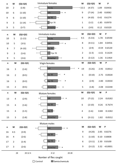 Number of Anastrepha fraterculus caught in traps with or without the stimulus under field cage experiments. Immature flies, mature-virgin females, and mature-mated flies were considered in separate experiments. Trans-tetrahydroactinidiolide (Dimethyl) and two epianastrephin-anastrephin formulations were considered: 95 wt.% epianastrephin (Epi 95) and 70 wt.% epianastrephin (Epi 70). Bars denote mean values (+SE). N (number of cages evaluated with 100 flies each), Median (M), Q1–Q3, and statistical values (W and p) are also included on the figure sides. Asterisks denote significant differences (Wilcoxon test).