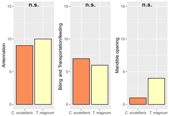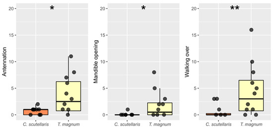 - Chemical attack: the ant uses its chemical repellent to the eggs/larvae (this behavior is performed by applying the venom topically, using the spatulate stinger in C. scutellaris and by short distance spraying in T. magnum).