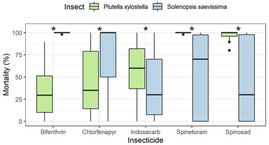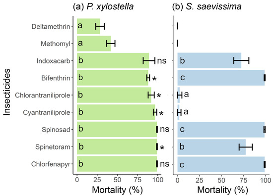 3.1. Efficacy of Insecticides for Controlling P. xylostella and Their Toxicity to S. saevissima