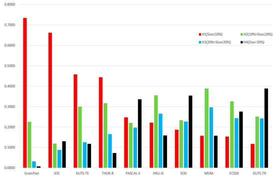 With large-scale datasets and deep network structures proposed and continuously updated, saliency object detection has made great progress, but small object detection in a cluttered background is still a challenging problem. The popular saliency detection datasets, such as DUTS-TR [27], DUTS-TE [27], THUR-B [28], PASCAL-S [29], HKU-IS [30], SOD [31], MSRA [32] and ECSSD [33], assume that each image contains only one or two large salient objects, and that the objects are mostly located in the center of each image. These datasets ignore the small objects and non-salient objects in real-world scenes. Fan et al. [34] collected a dataset named Salient in Clutter (SOC), which contains 6000 images; half of them are pure texture images with non-salient objects. We considered small insects and non-salient images with pure grain backgrounds when constructing the dedicated dataset, GrainPest. As shown in Figure 1, we calculated the ratio between the salient objects and the image area as the scale attribute of common saliency detection datasets with formula (1). The image was defined as containing small salient objects if the area ratio was no larger than 10%. It can be seen that the proportion of small objects in both the GrainPest dataset and the SOC dataset [34] is more than 65%.