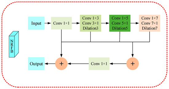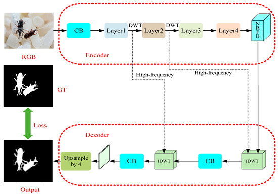 Figure 2 shows the architecture of the proposed FESNet. In the stage of coding, an RGB image, after convolved, will enter the network layer composed of the DWT and DCT, to obtain the low-frequency and high-frequency information of the image. Then, a New Receptive Field Block (NRFB) will aggregate the features of the input low-frequency information. In the stage of decoding, the aggregated features and the two groups of high-frequency components output from the encoder will be upsampled by the inverse discrete wavelet transform (IDWT). Finally, the decoder uses the convolutional block to refine the feature map and reconstructs the image through bilinear interpolation. In Figure 2, RGB and GT, respectively, refer to the original input image and the pixel-wise labeled ground truth image. CB is a common Convolution Block with a receptive field of size 3 × 3.
