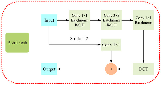 Figure 3. Bottleneck with discrete cosine transforms added. After the data is subjected to three Conv Blocks, the low-frequency information is enriched by the DCT. Inclusively, when Strip is 2, it will perform the Conv operation.