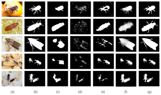 We trained our network on GrainPest and SOC datasets. The dataset GrainPest contains 500 pixel-level labeled grain pest images. The grain pest images are made in the background of wheat, corn, rice, and other grains. The grain pests include Sitophilus zeamais (Sz), Sitotroga cerealella (Sc), Rhizopertha dominica (Rd), Plodia interpunctella (Pi), and other species of grain pest. We gathered the images by taking pictures at granaries and obtaining images from professional entomology web sites, such as Insect Images (https://www.insectimages.org/, accessed on 6 November 2021) and iNaturalist (https://www.inaturalist.org/, accessed on 18 December 2021). In the actual detection, a variety of grains were uninfected with pests, so the dataset GrainPest contains 50 non-salient object images with pure grains as the background. The dataset SOC contains 6000 images, including salient and non-salient images of more than 80 categories of daily objects. The attributes of non-salient and small objects in the GrainPest and SOC datasets bring more challenges to salient detection models than common datasets.