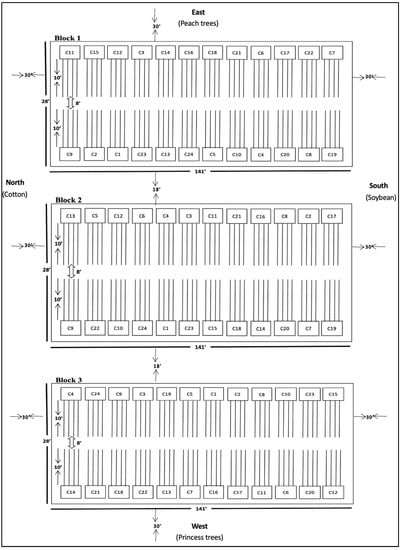 The experimental field was situated at least 9.1 m (30 feet) from the adjacent fields (Figure 1). The inter-block distance was 5.49 m (18 feet) (Figure 1). The distance between the two big columns within each block was 2.44 m (8 feet) (Figure 1). The layout map of the experimental field in fall of 2020 was included to indicate the experimental setup (Figure 1). In the 2020 fall season, there was a peach (Prunus persica (L.) (Rosales: Rosaceae)) orchard on the east of the experimental field, a cotton (Gossypium hirsutum (L.) (Malvales: Malvaceae)) field to the north, a soybean (Glycine max (L.) Merrill (Fabales: Fabaceae)) field to the south, and a princess tree (Paulownia tomentosa (Steud.) (Lamiales: Paulowniaceae)) orchard to the west (Figure 1). The experiment was conducted in the same field using a similar layout map during the 2021 spring season except that there was only a peach orchard to the east and a princess tree orchard to the west.