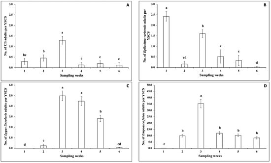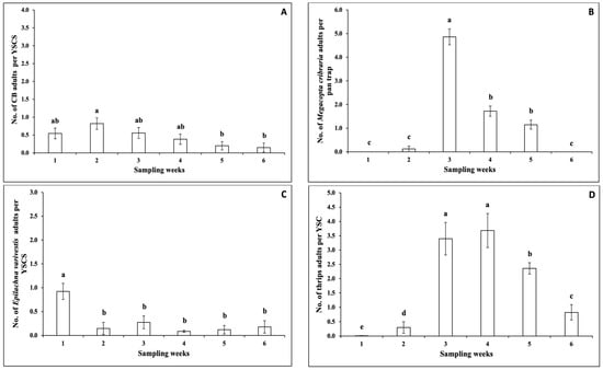 Mean (± SEM) number (No.) of adult insect pests per YSCS (captured on one yellow sticky card (YSC) and collected from four sweeps (S)) over six sampling weeks (Week 1 (25 days after plant emergence) and Weeks 2–6) in the 2021 spring season. The insect pests included (A) cucumber beetle (CB); (B) Epilachna varivestis; (C) Lygus lineolaris; and (D) Empoasca fabae. In each figure, different letters above the error bars indicate significant differences (p < 0.05) among sampling weeks.