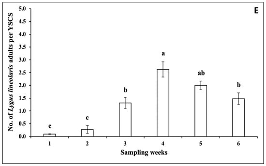 Mean (±SEM) number (No.) of adult insect pests per unit (pan trap, YSC (captured on one yellow sticky card), or YSCS (YSC and collected from four sweeps (S))) over six sampling weeks (Week 1 (25 days after plant emergence) and Weeks 2–6) in the 2020 fall season. The insect pests included (A) cucumber beetle (CB); (B) Megacopta cribraria; (C) Epilachna varivestis; (D) thrips; and (E) Lygus lineolaris. In each figure, different letters above the error bars indicate significant differences (p < 0.05) among sampling weeks.