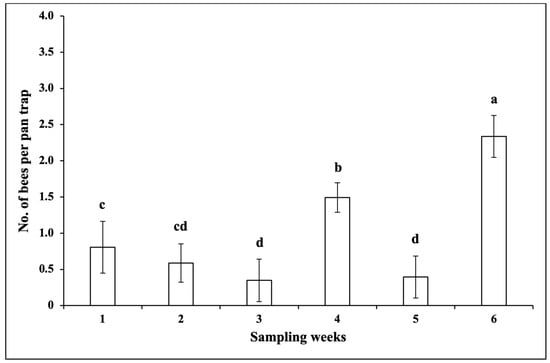 Mean (±SEM) number (No.) of bees per pan trap over six sampling weeks (Week 1 (25 days after plant emergence) and Weeks 2–6) in the 2020 fall season. Different letters above the error bars indicate significant differences (p < 0.05) among sampling weeks.