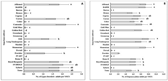 Mean (±SEM) number (No.) of adult insect pests per YSCS (captured on one yellow sticky card (YSC) and collected from four sweeps (S)) on the 24 snap bean cultivars (‘Affirmed’, ‘BA0958’, ‘Barron’, ‘Bronco’, ‘Caprice’, ‘Carson’, ‘Colter’, ‘Contender’, ‘Gold Mine’, ‘Golden Rod’, ‘Greenback’, ‘Greencrop’, ‘Jade’, ‘Long Tendergreen’, ‘Maxibel’, ‘Momentum’, ‘Prevail’, ‘Provider’, ‘PV-857’, ‘Roma II’, ‘Royal Burgundy’, ‘SV1003GF’, ‘Sybaris’, and ‘Tema’) in the 2021 spring season. The insect pests included (A) Lygus lineolaris and (B) Empoasca fabae. In each figure, different letters beside the error bars indicate significant differences (p < 0.05) among snap bean cultivars.