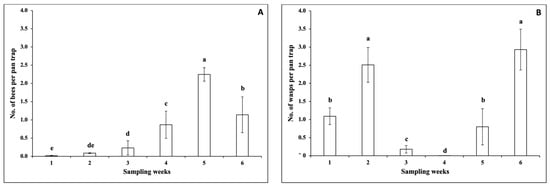 Mean (±SEM) number (No.) of bees (A) and wasps (B) per pan trap over six sampling weeks (Week 1 (25 days after plant emergence) and Weeks 2–6) in the 2021 spring season. In each figure, different letters above the error bars indicate significant differences (p < 0.05) among sampling weeks.