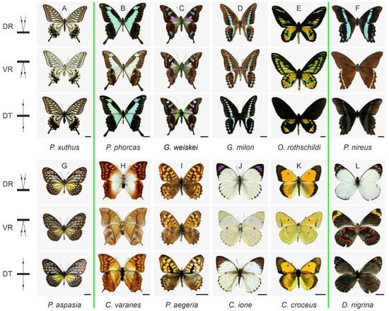 We surveyed the butterfly species in our collection by photographing their dorsal wing sides in both reflected (Figure 1A–L; DR) and transmitted (Figure 1A–L; DT) light. We only show photographs of the ventral side in reflected (Figure 1A–L; VR) light, because the transmission patterns of both wing sides were identical. Figure 1 presents several papilionid, nymphalid, and pierid butterflies.