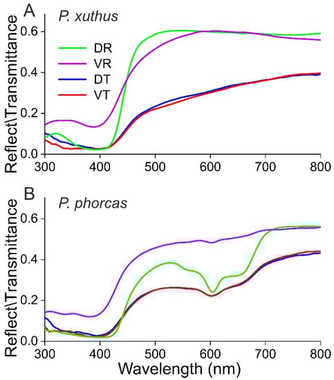 Reflectance and transmittance spectra of butterfly wings: (A) Papilio xuthus Linnaeus, 1758; (B) Papilio phorcas Cramer, 1775. DR—dorsal reflection; VR—ventral reflection; DT—dorsal transmission; VT—ventral transmission.