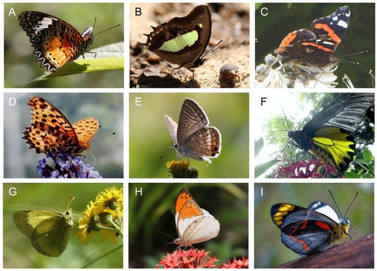 Butterflies with translucent wings illuminated from above: (A) Cethosia penthesilea Cramer, 1777; (B) Polyura athamas Drury, 1773; (C) Vanessa atalanta Linnaeus, 1758; (D) Argyreus hyperbius Linnaeus, 1763; (E) Lampides boethius Linnaeus, 1767; (F) Troides aeacus Felder and Felder, 1860; (G) Colias palaeno orientalis Staudinger, 1892; (H) Hebomoia glaucippe Linnaeus, 1758; (I) Delias nigrina Fabricius, 1775.