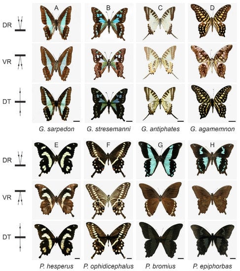Wing patterning and translucence of papilionid butterfly wings: (A) Graphium sarpedon Linnaeus, 1758; (B) Graphium stresemanni Linnaeus, 1758; (C) Graphium antiphates Cramer, 1775; (D) Graphium agamemnon Linnaeus, 1758; (E) Papilio hesperus Westwood, 1843; (F) Papilio ophidicephalus Oberthür, 1878; (G) Papilio bromius Doubleday, 1845; (H) Papilio epiphorbas Boisduval, 1833. DR—dorsal reflection; VR—ventral reflection; DT—dorsal transmission; scale bars: 1 cm.
