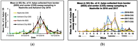 Sweep samples were collected at each study location (at the border or the center of the field) within a block at the rate of 25 sweeps per block, using a 38.1 cm diameter sweep net (BioQuip Products, Inc., Rancho Dominguez, CA, USA). Twenty-five sweeps are generally used for pest monitoring in soybean [22]. The collected sweep samples from each block per location were placed in a labeled plastic bag and stored in a cooler until they were brought to the lab. Once in the lab, the insects were transferred to 500 mL plastic deli containers and the containers were placed in a freezer until they were evaluated. The sweep samples were examined under a stereomicroscope, and the number of H. halys nymphs and adults were counted and recorded. Antennal markings and wing characteristics were used to identify H. halys [1]. Weekly sweep samples were collected from July to October 2016 in Nashville and Ashland City and from July to October 2017 in Nashville.