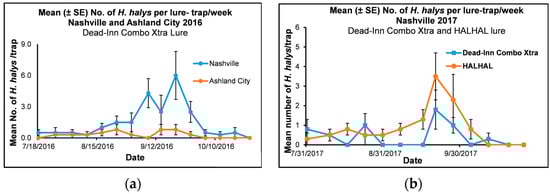 Mean (±SE) number of adult and immature Halyomorpha halys collected per trap/week in soybeans from (a) July to October 2016 in Nashville (Davidson County) and Ashland City (Cheatham County), Tennessee using a Dead-Inn Combo Xtra lure (combined Dead-Inn H. halys and Harlequin bug lures) with H. halys pyramid traps (b) July to October 2017 conducted in Nashville (Davidson County), Tennessee using two H. halys lures (Dead-Inn Combo Xtra [combined Dead-Inn H. halys and Harlequin bug lures] and HALHAL 25) with H. halys pyramid traps.