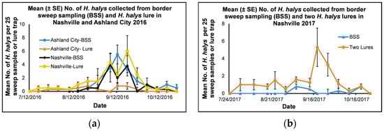 Mean (±SE) number of adult and immature Halyomorpha halys per 25 sweep samples/block collected from (a) border sweep sampling (BSS) or H. halys lure (Dead-Inn Combo Xtra lure) in soybeans from July to October 2016 conducted in Ashland City (Cheatham County) and Nashville (Davidson County), Tennessee (b) border sweep sampling (BSS) or both H. halys lures (Dead-Inn Combo Xtra and HALHAL 25) in soybeans from July to October 2017 conducted in Nashville (Davidson County), Tennessee.