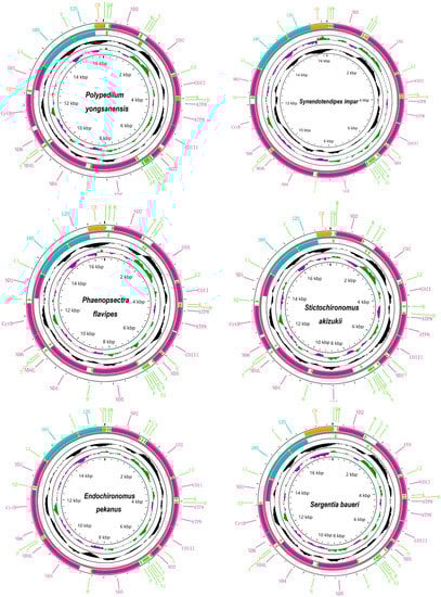 We sequenced about three Gb raw reads for each sample. A total of 14 mitogenomes of Chironomidae were obtained in this study, of which five were complete mitogenomes and nine were linear mitogenomes, and all of them were submitted in GenBank with accession number OP950216–OP950228, OK513041 (Table 2 and Table S1). The whole length of newly obtained sequences ranged from 15,582 (Polypedilum masudai) to 17,810 bp (Sergentia baueri), the variation in which was mainly caused by the unstable size of the CR (Table 2). All newly assembled mitogenomes contained the typeset of one CR and 37 genes which included 13 PCGs, 22 tRNAs, and two rRNAs (Figure 1). Most of the newly assembled mitogenomes were similar to those previously published for Chironomidae in length [,,,,]. Sequence features of the represented species are given in Figure 1.