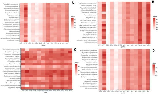 Difference in AT content of protein coding genes of Polypedilum generic complex mitogenomes. (A) First-codon positions; (B) second-codon positions; (C) third-codon positions; (D) first/second-codon positions.