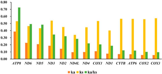 The Ka/Ks value (ω) was usually used to measure the rate of sequence evolution by natural selection [,]. The result of Ka/Ks ratio of all 13 PCGs was less than one, ranging from 0.0958 (COX3) to 0.7251 (ATP8) (Figure 3), which was same as other insects [,]. The evolution rate of 13 PCGs was as follows: ATP8 > ND6 > ND5 > ND3 > ND2 > ND4L > ND4 > COX1 > ND1 > CYTB > APT6 > COX2 > COX3. This result indicated that, in most cases, selection eliminated deleterious mutation, and all of them evolved under purifying selection pressure (Figure 3). In PCGs, each gene was under different purifying selection. ATP8, ND6, and ND5 showed higher ω value, indicating that they exhibited relatively relaxed purifying selection pressure. Meanwhile, COX2 and COX3 were under the hardly purifying selection, which were similar to previous research results regarding chironomids [,,,].