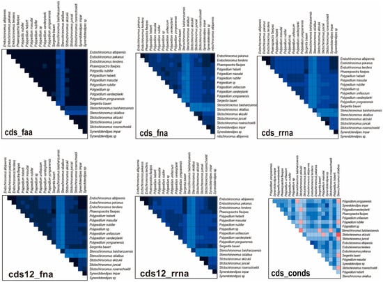 Heterogeneity analysis for different matrices. Colored squares represented pairwise Aliscore values. Score values ranged from −1 (indicated fully random similarity, dark blue) to +1 (indicated non-random similarity, bright orange, or red).