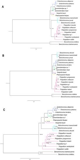 Phylogenetic trees of the Polypedilum generic complex: (A) BI tree based on analysis cds_fna in Phylobayes. (B) BI tree based on analysis of cds_rrna in Phylobayes. (C) ML tree based on the anaysis cds_faa with PMSF model in IQTREE. Support values on nodes indicate Bayesian posterior probabilities in topology A and B, while they represent SH-aLRT/UFBoot2 in topology C.