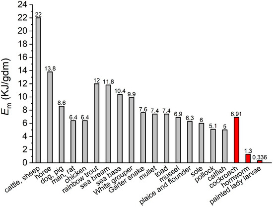 Since Em has been considered a fundamental biochemical property of cells [,], all the theoretical studies, to the best of our knowledge, such as the metabolic theory of ecology [,] and the dynamic energy budget theory [,], treated it as a constant across species. Wieser [] and Ricklefs [] concluded that the “consensus value” of Em is about 7.2 KJ/g of dry body mass (KJ/gdbm) for a wide range of organisms. Previous comparative studies have found Em varying within a four-fold range (e.g., see [,,] and Figure 1) across ectothermic and endothermic species with very different body sizes and biomass components, including fish, amphibians, reptiles, Bivalvia, birds, and mammals. The average of the above species is 9.16± 4.30 KJ/gdbm, close to the “consensus value” of 7.2 KJ/gdbm. We have found [,], however, a great variation in Em in insect species. Painted lady caterpillars (Vanessa cardui) and Turkestan cockroach nymphs (Blatta lateralis), which have a similar dry body mass range, have sharply different values of Em, i.e., 0.336 and 6.91 KJ/g of dry mass (gdm), respectively. The variation is not caused by diet and activity levels of the animals, and cannot be explained by the difference in their body components [].