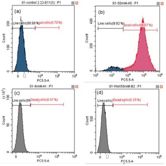 tert-butyl hydroperoxide (t-BHP), which is more thermodynamically stable than H2O2, was used to induce oxidative stress. Cells were collected after gentle pipetting and an initial cell density of 1 × 106 cells mL−1 was seeded on a six-well plate. After 30 min, fresh media containing t-BHP was added to final concentrations of 3, 6, 9, 12, 15, 50, 100, and 200 mM. After a 6 h incubation, treated cells were collected directly in the 15 mL centrifuge tubes and washed twice at room temperature in 0.1 M cold PBS buffer. Cell pellets were resuspended in 5 µL 7AAD staining solution, incubated in the dark at room temperature for 15 min, and cells were analyzed within an hour. Using the flow cytometer (Beckman Coulter Cytoflex, Indianapolis, IA, USA), Forward scatter (FSC) vs. Side scatter (SSC) gates were set appropriately to exclude debris and cell aggregates, untreated cells (negative control) stained with 7-AAD were used to define the basal level of dead cells and set up the necessary laser compensation, and the 7-AAD fluorescence was collected at the FL3 channel.
